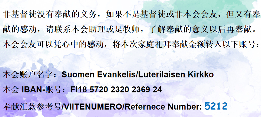 - 2021年9月5日周日,下午13:00—14:30,主任牧师Riikka Reina来Alppila教堂为我们分发圣餐。因为人数受限,圣餐礼拜将分组进行。请大家在家参加完线上礼拜之后,来到教会领圣餐。圣餐礼拜每月只有一次,请大家珍惜领主杯的机会,积极报名参加。