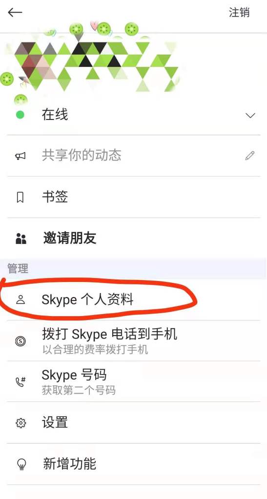 - 点击“skype个人资料”选项(在“管理”条下方,图二)